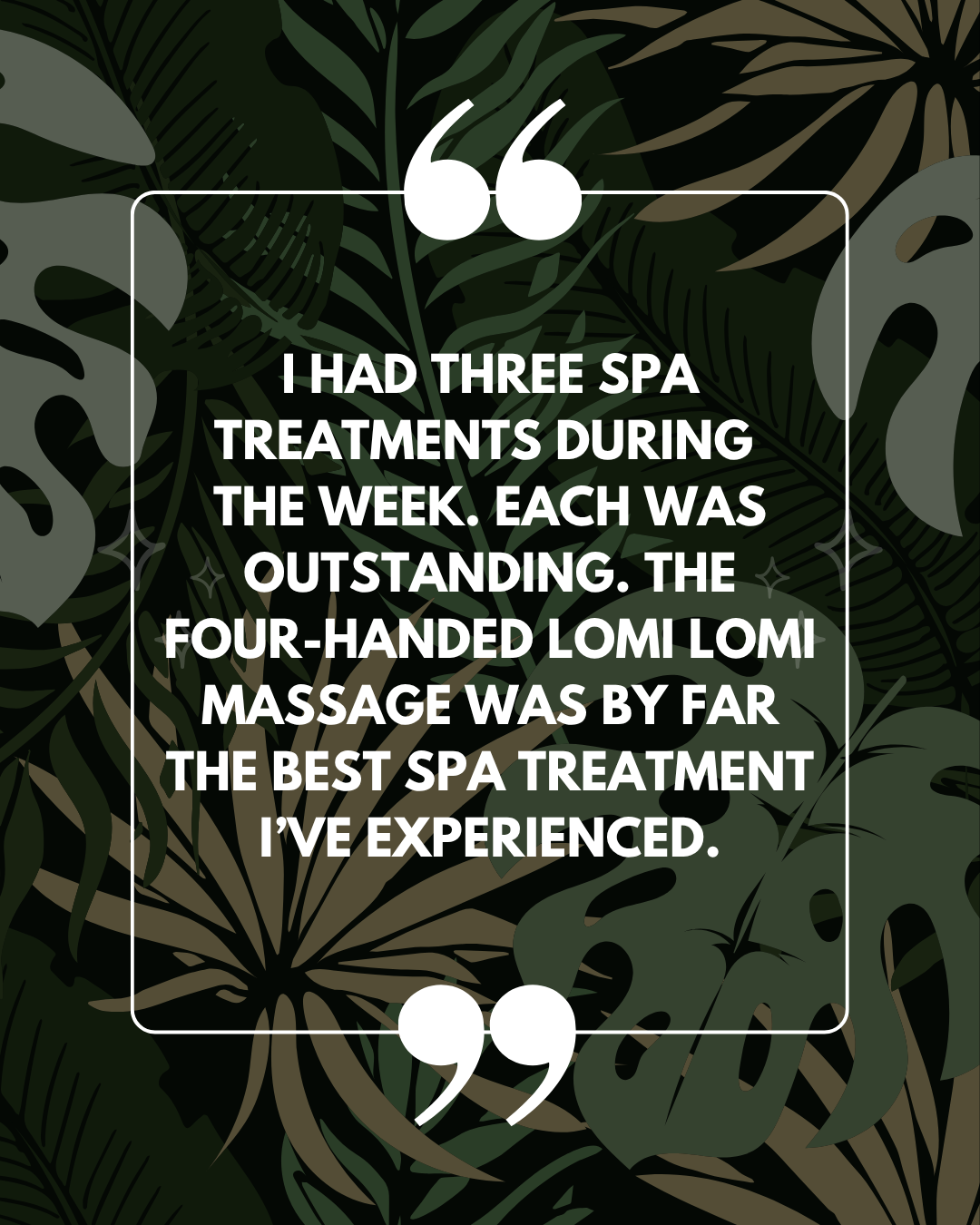 Our favorite was the 4-handed Lomi Lomi, a tradition Hawaiian massage given by two massage therapists. Absolutely incredible. We also experienced the foot reflexology, cupping, and tarot readings. All were exceptional, and affordable.