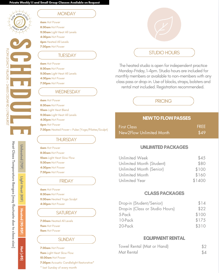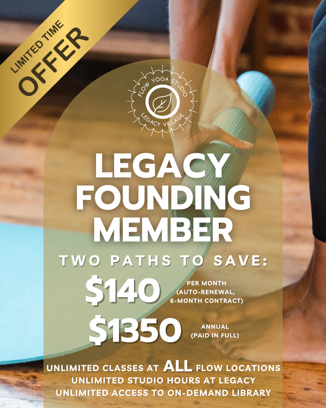 Once Legacy Village opens, all new and renewing memberships start at $160/month and $1,400 annually. Lock in your Legacy now, and flow everywhere, anytime, unlimited. Text or call the studio at 440.459.1843 with questions.