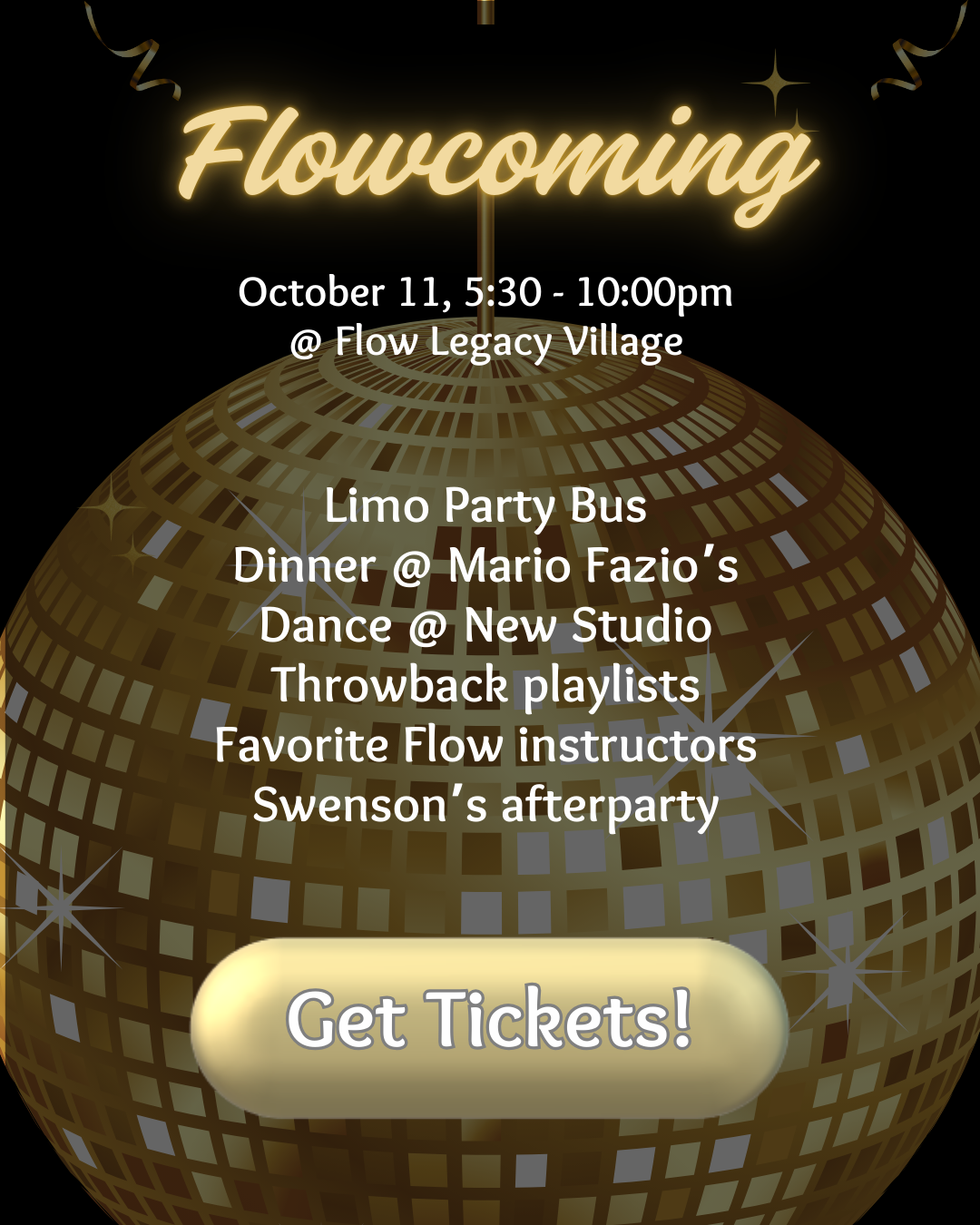 Join Shannon, Kevin, and some of your favorite Flow instructors and community members for a throwback adult homecoming without the chaperones! Whether you missed homecoming the first go-around, it was a night worth forgetting, or it was a blast from your past, now’s your chance for a re-do. Three ways to participate: