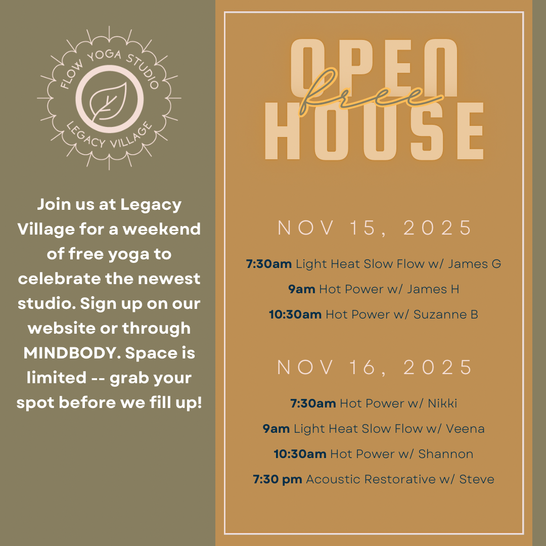 Watch these videos for screen-by-screen help signing up through our website or Mindbody app. If you’re new to Flow, be sure to use the 1st Class Free when scheduling. Our November Legacy Village classes and free Open House weekend November 15 and 16 are now available to book. Hope to see you there!