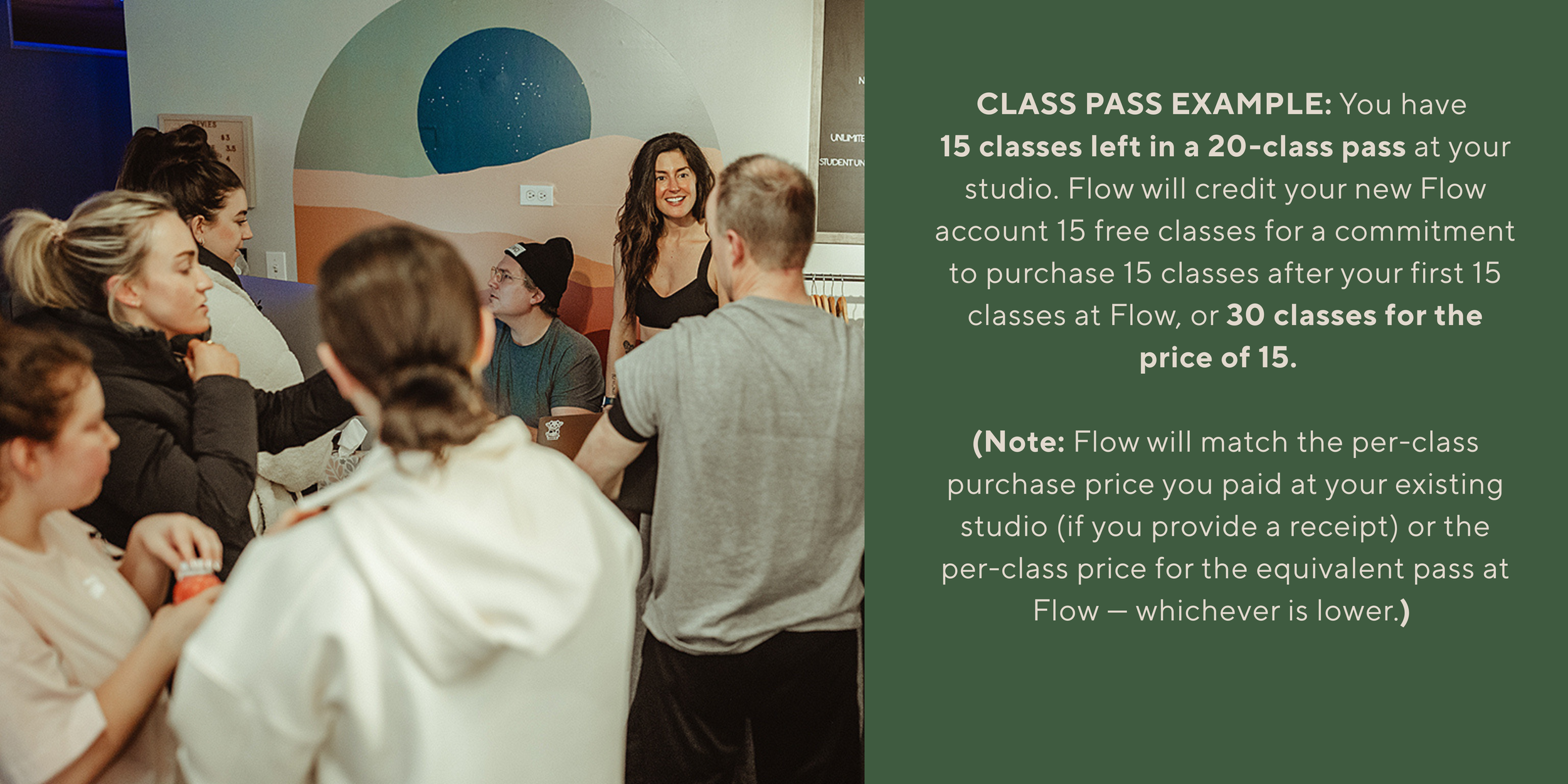When you arrive at the studio for your 1st Class Free, sign a waiver and contractual commitment to renew or purchase the equivalent membership or package once your transferred membership or passes are used up at Flow.